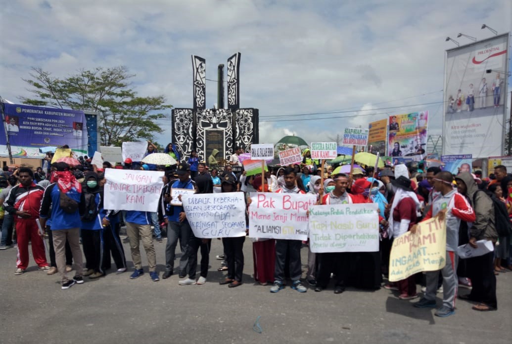 TIMIKA, Kabartanahpapua.com – Seribu lebih guru Sekolah Menengah Atas (SMA) dan Sekolah Menengah Kejuruan (SMK) se-Kabupaten Mimika kembali berunjuk rasa mendesak pembayaran tunjangan guru SMA-SMK tahun 2018.