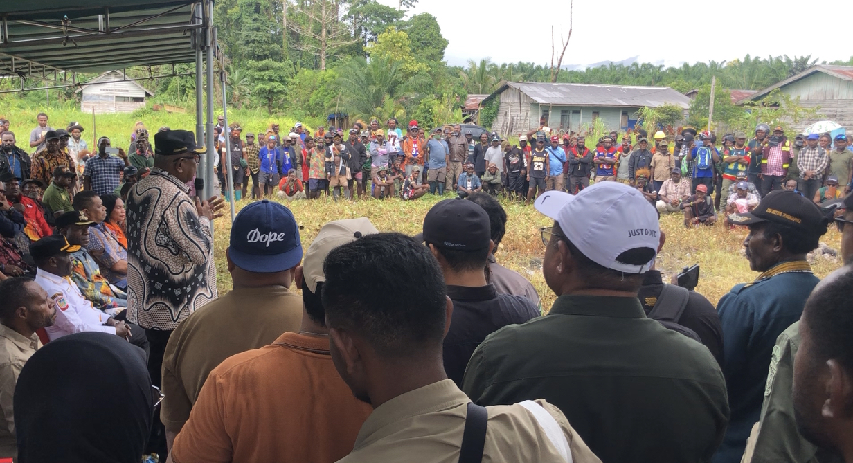 “Hari ini saya datang lihat kamu. Saya mau bicara wilayah pemerintahan. Ini Kabupaten Mimika sampai di gunung. Bapa ibu semua orang Mimika,” ujar Bupati Rettob mengawali sambutan.