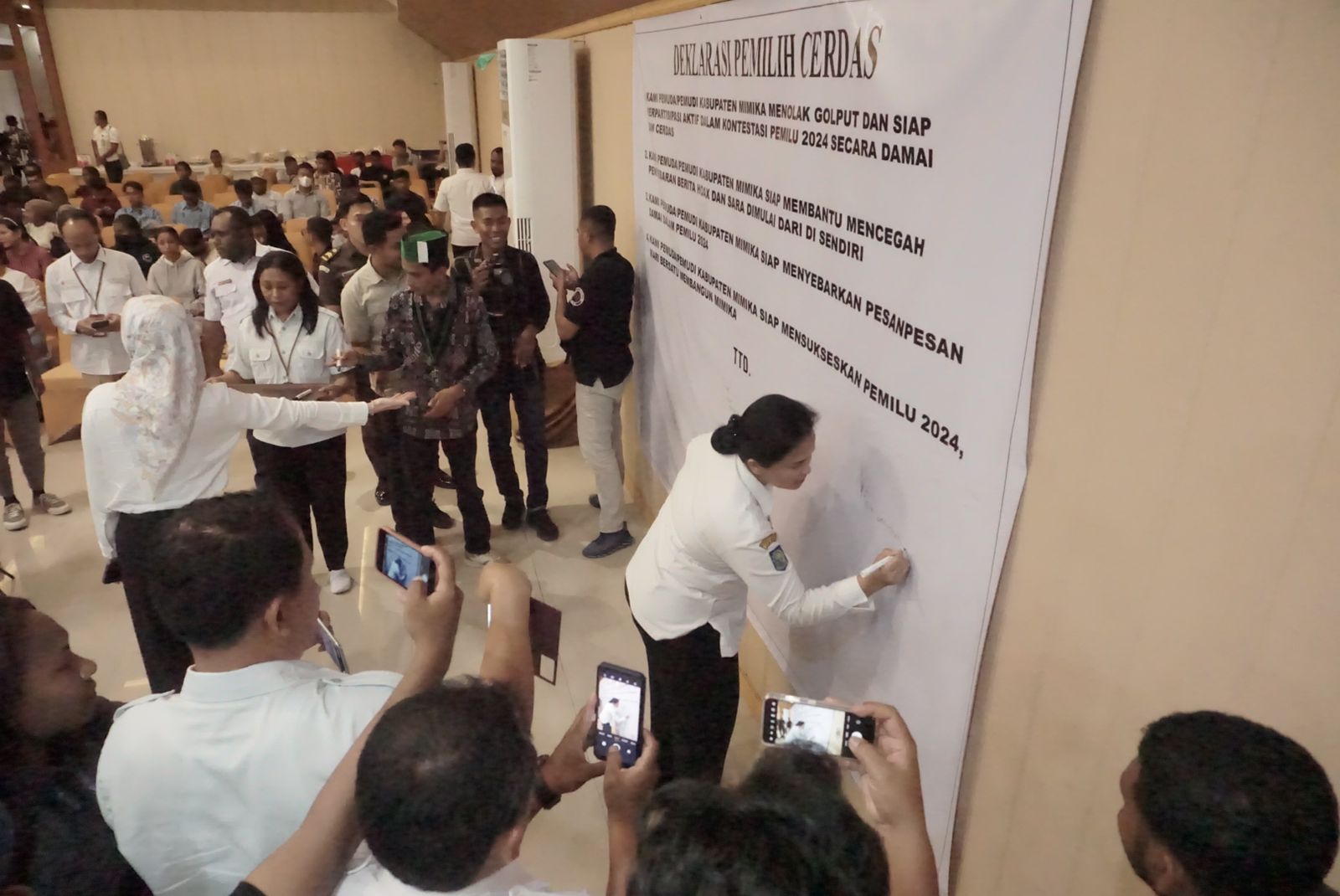 TIMIKA,KTP.com – Badan Kesatuan Bangsa dan Politik (Kesbangpol) Kabupaten Mimika menggelar Talk Show dan Deklarasi Pekilih Cerdas bersama anak-anak muda generasi z (Gen-Z) di Kabupaten Mimika, di Ballroom Hotel Cartenz Timika, Mimika, Papua Tengah, Rabu (7/2/2024).