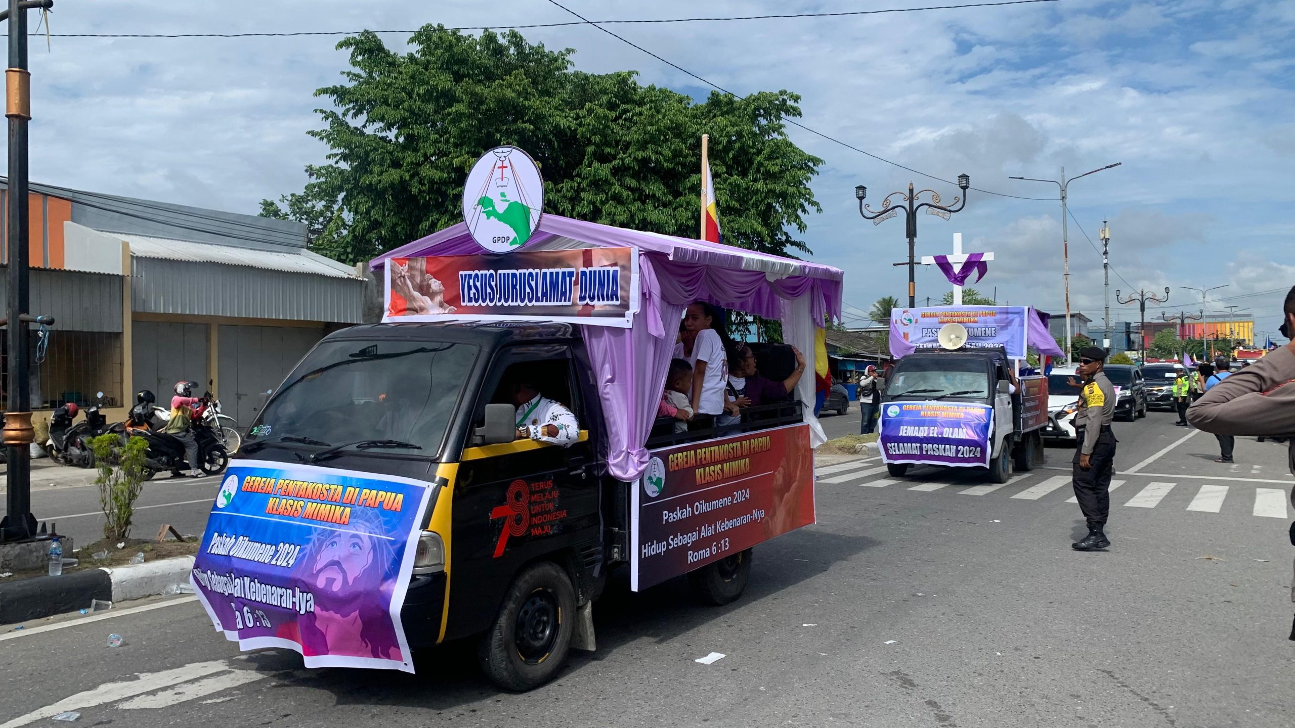 Parade Paskah Oikumene ini diikuti oleh puluhan mobil hias dari berbagai gereja di Mimika. Ada juga pengendara sepeda motor yang mengekor di belakangnya. Semua kendaraan dihiasi ornamen bernuansa kristiani, mulai dari mobil hingga sepeda motor.