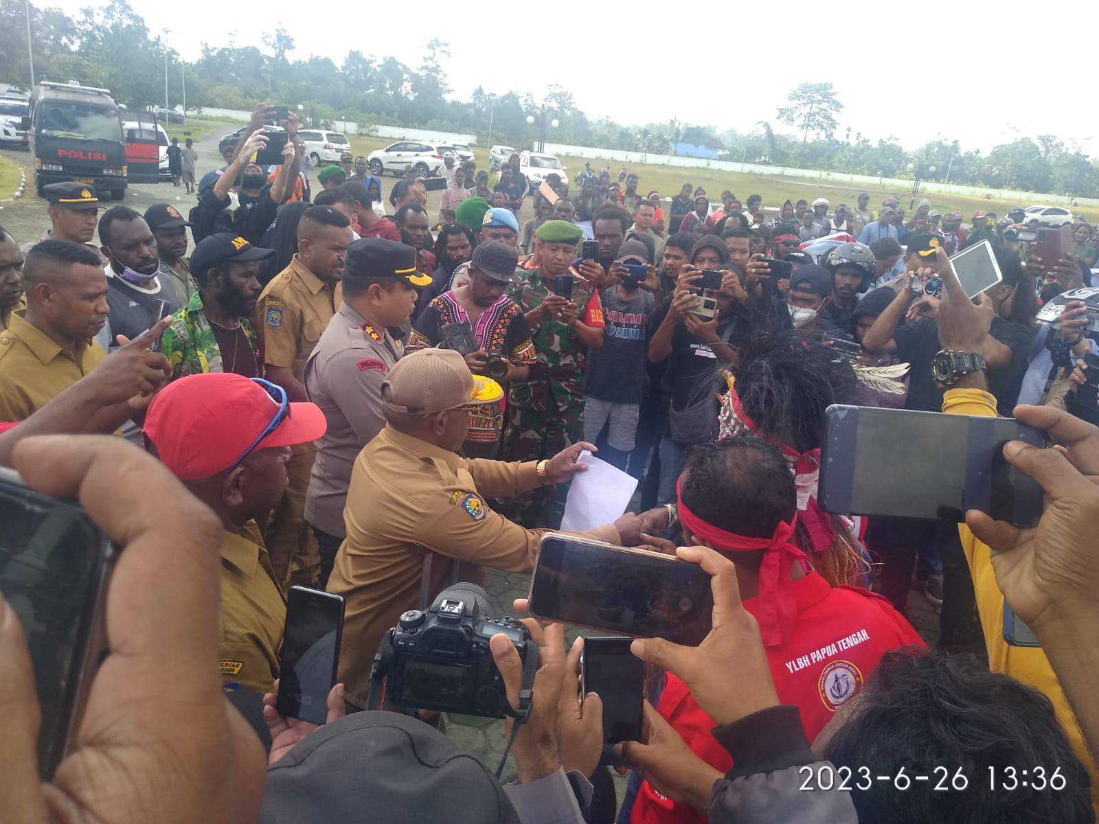 Pendemo serahkan Tuntutanya ke Pj Sekda Mimika Petrus Yumte di halaman Kantor Sentra Pemerintahan Pemda Mimika.