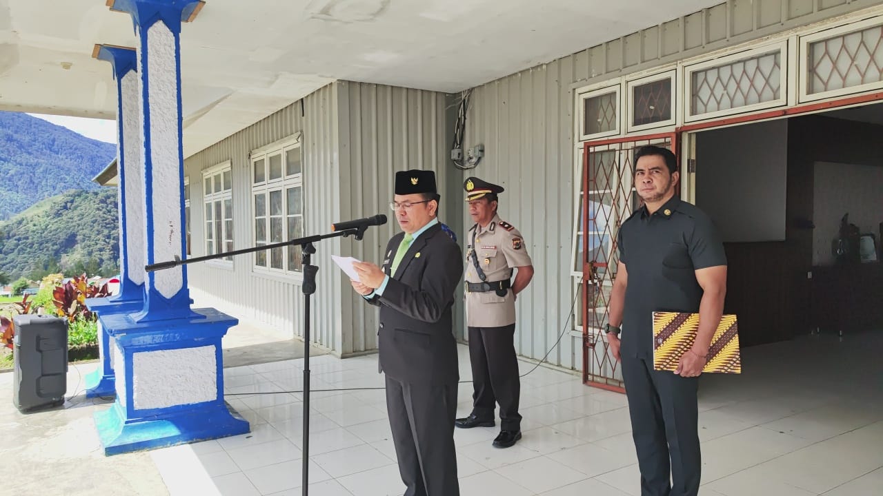 Penjabat (Pj) Bupati Puncak Ir. Darwin Tobing sebegai inspektur upacara Hari Otda ke 28, memembacakan sambutan tertulis Mentri Dalam Negeri (Mendagri), Muhammad Tito Karnavian.