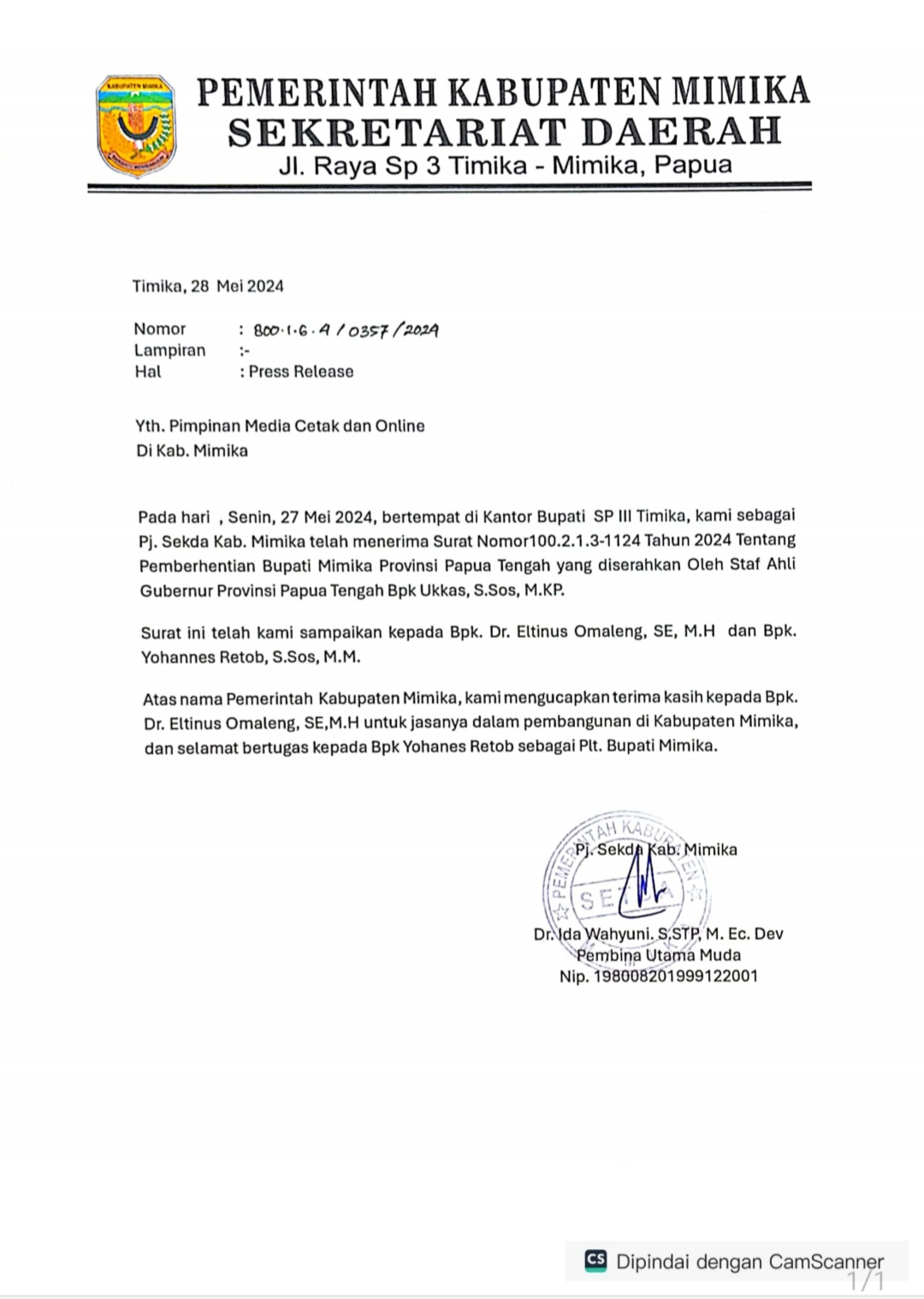 TIMIKA,KTP.com – Penjabat (Pj) Sekretaris Daerah Mimika,Provinsi Papua Tengah, Dr Ida Wahyuni, mengatakan pihaknya telah menerima surat pemberhentian Bupati Mimika pada Senin (27/5/2024). Hal ini disampaikan melalui siaran pers yang dikeluarkan oleh Pj Sekda Mimika ,Rabu(29/5/2024).
