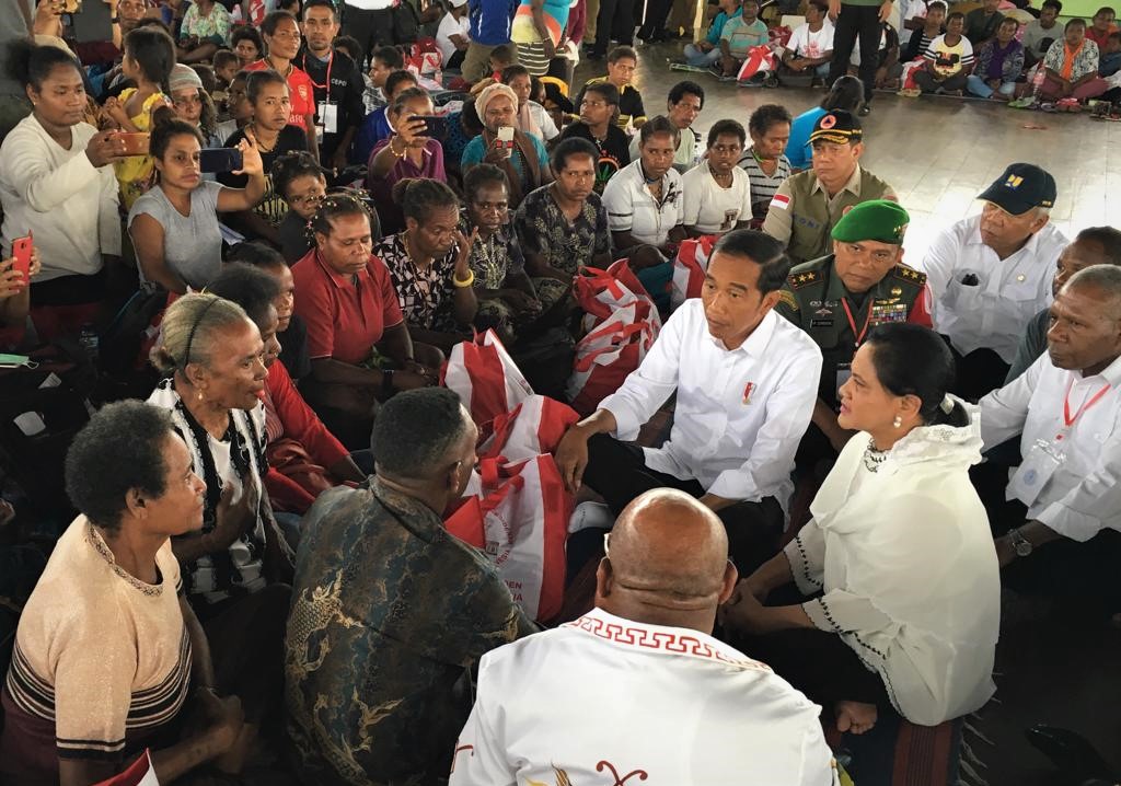 Tiba pukul 14.15 WIT, Presiden berbincang dengan pengungsi korban banjir bandang yang melanda wilayah Sentani, Kabupaten Jayapura beberapa waktu lalu.