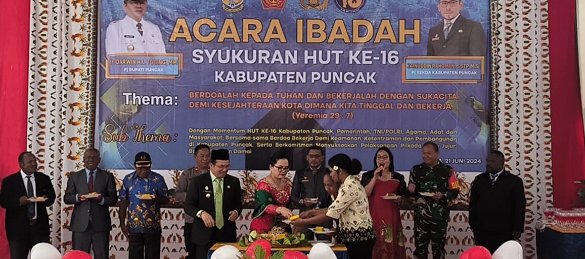 Tepanya pada tanggal 21 Juni 2024 ini Kabupaten Puncak sudah 16 tahun,dan ada hut kabupaten kali ini,di gelarna Ibadah syukur, dipimpin oleh Pdt,Theis Wonda, S.Th, mengambil sorotan tema dari Nats alkitab perjanjian lama Yeremia 29:7, yang juga menjadi Thema Hut tahun ini, yakni berdoalah Kepada Tuhan dan Bekerjalah dengan sukacita demi kesejahteraan Kota dimana Kita tinggal dan Bakerja.