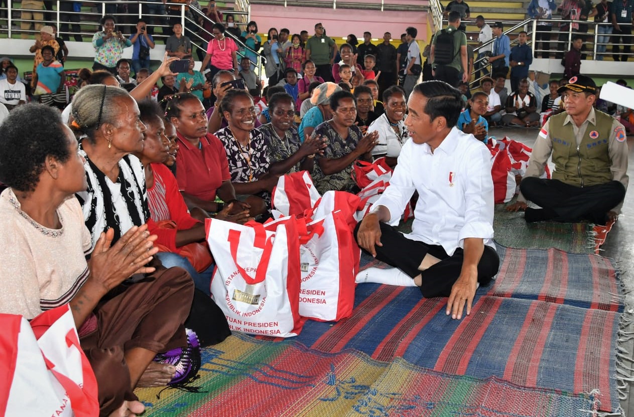 Kepala Negara beserta Ibu Negara Iriana Joko Widodo yang menemui pengungsi di Posko pengungsian GOR Touware, kampung Kwadeware, distrik (kecamatan) Waibu, Kabupaten Jayapura, Senin (1/4/2019).