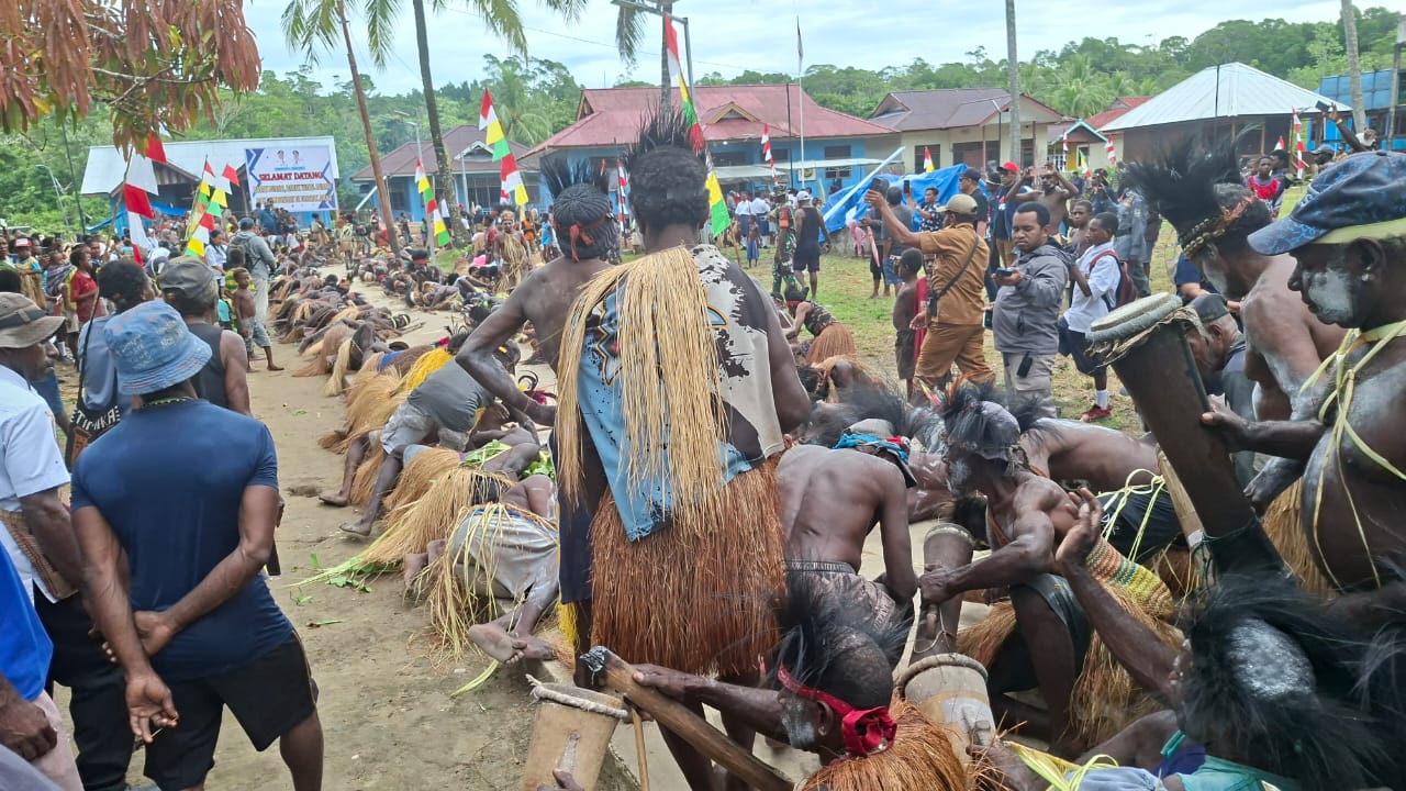 Sejumlah tokoh adat dan masyarakat tampak mengenakan pakaian tradisional serta memukul tifa, menandai kembalinya Bupati Rettob.